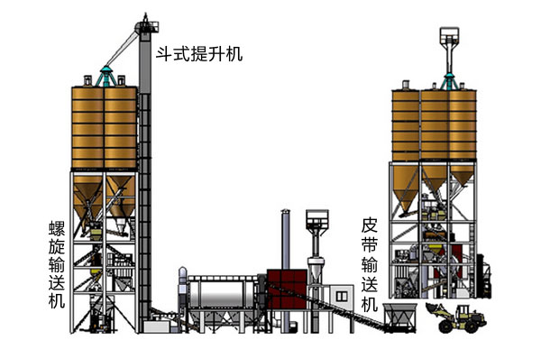 【生產流程描述】1、骨料烘幹:A、三回程烘幹機,小時產量100噸。2、變頻調速皮帶輸送機機供料,依據骨料潮濕程度調整供料速度,確保出料含水率和烘幹產量的匹配。3、袋式除塵器、高通風,提高除塵效果,保護環境。布袋除塵兩級分離除塵,排除的廢氣經過脫硫塔脫硫。4、粉體料分別螺旋輸送機喂料到秤鬥計量。5、根據當地條件選用熱源。有兩種選擇,一是配件沸騰爐,用以燃燒生物燃料或煤炭;二是配做燃燒室,用以燃燒天然氣或油。6、烘幹的骨料經過篩分去粗後進入鬥式提升機。篩分機可選用振動篩或圓筒篩。經過攪拌混合圴勻的物料從攪拌機卸入成品鬥,通過氣動三通分為兩路:一路直接經過散裝機進入散裝車運往工地。另一路經過螺旋輸送到包裝過度倉包裝。