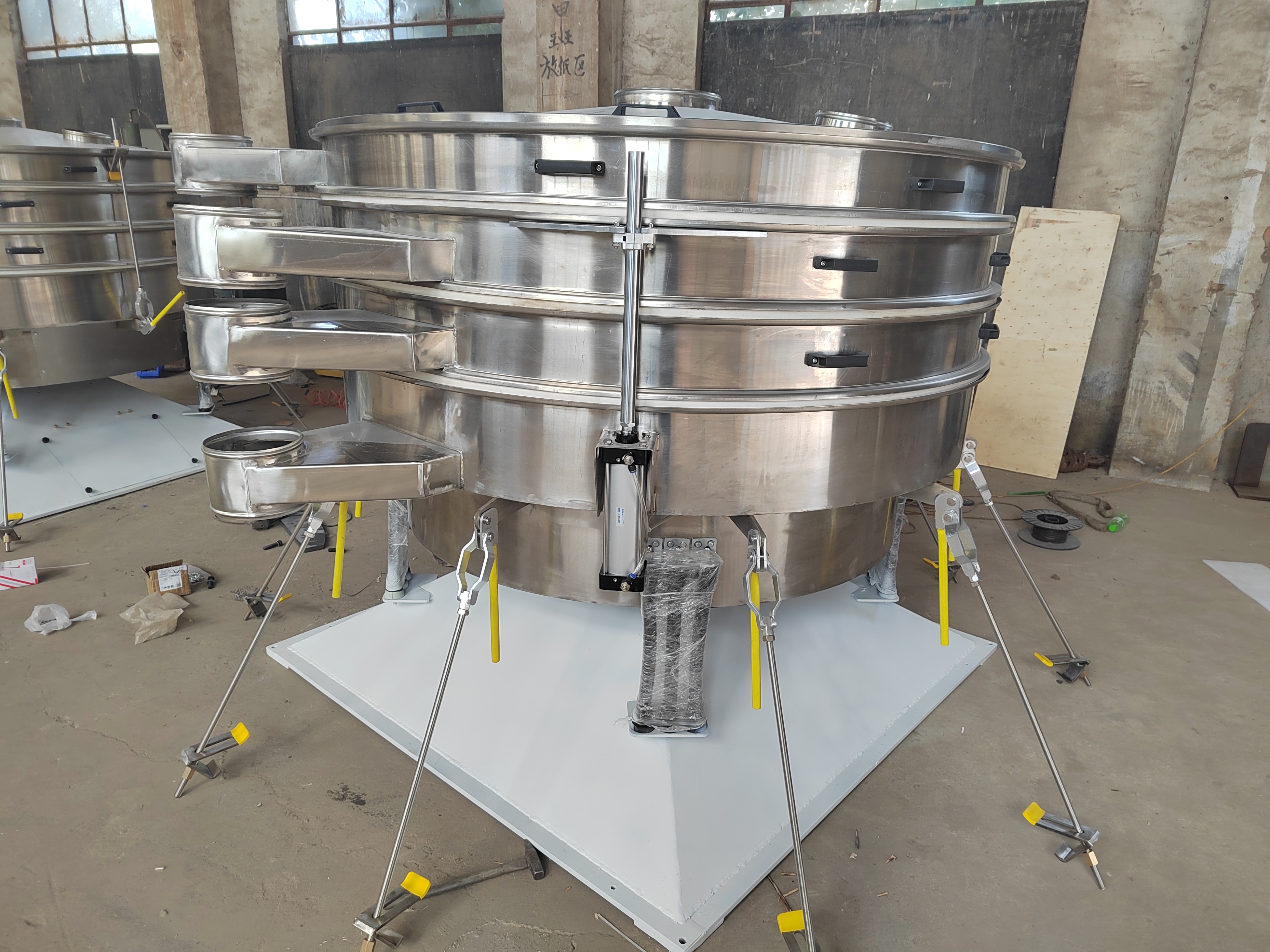 過濾篩是一種用於漿液過濾的篩分機,由振動器、礦漿分配器、篩框架、懸架彈簧、篩網等部件組成。結構可靠。振動力。篩分效率高。振動噪音低。堅固耐用。維護方便。過濾篩廣泛應用於礦山、建材、交通、能源、化工等行業。陶瓷漿料,釉料行業使用。 過濾篩采用高頻,利用氣缸偏心軸振動器和偏塊調節振幅,加速了大密度有用的礦物和分離效果,增加了小於分離粒度的材料與篩孔接觸的概率。因此,它導致了良好的分離條件,使小於分離粒度的材料成為大比例的材料。所需驅動功率小,啟動時啟動電流小,噪音低;具有效率高、振幅小、篩分頻率