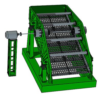 單軸振動篩有一個十分牢靠的篩箱,因為其結構是焊接及鉚接而成,在振動器的主軸上不僅中間位置有偏心軸,而且主軸兩頭也有能夠調節的偏心輪。在篩分時,電動機經由三角帶作用於振動器,傳動軸使偏心軸及偏心輪產生慣性力,這種慣性力會令篩箱作近似的圓形的運動,使物料得到了佳的篩分效果。